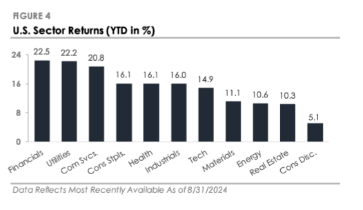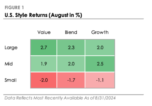 - The S&P 500 Index returned +2.3% in August, outperforming the Russell 2000 Index’s -1.7% return. Nine of the eleven S&P 500 sectors traded higher, led by Consumer Staples, Real Estate, Health Care, and Utilities.
