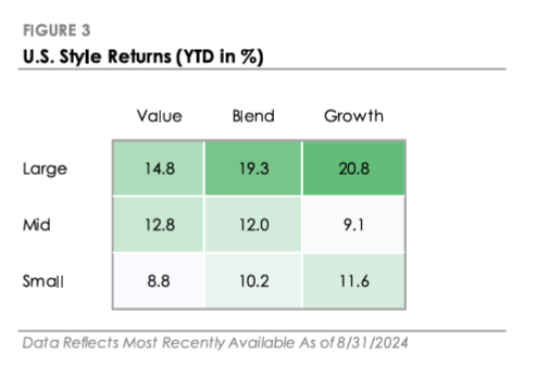 Stocks traded higher in August despite an early month selloff. The S&P 500 dropped over -5% in the first week after a report showed unemployment rose to 4.3% in July. Small-cap stocks underperformed as investors pulled back from riskier assets amid volatility. However, financial markets quickly stabilized and climbed throughout the month. The S&P 500 recovered all its losses, ending the month less than -1% below its all-time high from mid-July. The Nasdaq 100 Index, which includes the artificial intelligence companies that drove the stock market higher in early 2024, lagged the broader market. In the bond market, Treasury yields fell for the second consecutive month, driven by expectations for deeper rate cuts in response to rising unemployment. Bonds traded higher for a fourth consecutive month as Treasury yields declined and investors rushed to lock in current fixed income yields ahead of the first interest rate cut.